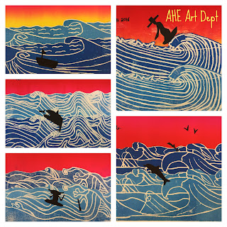 We started by looking at Hokusai's famous prints from the 36 views of Mt. Fuji series. Students created their own wave design with repeating lines to show movement in the water on a piece of 4.5"x12" printing foam. These waves were printed twice so they could be arranged to show depth. We learned how to do what I call a rainbow roll with two warm colors to make a nice gradient in the sky and then glued it all together. On the last day we cut out silhouettes of surfers, boats, dolphins, birds, and I even spy a surfing yoda with light saber. I just love seeing what these artist come up with!